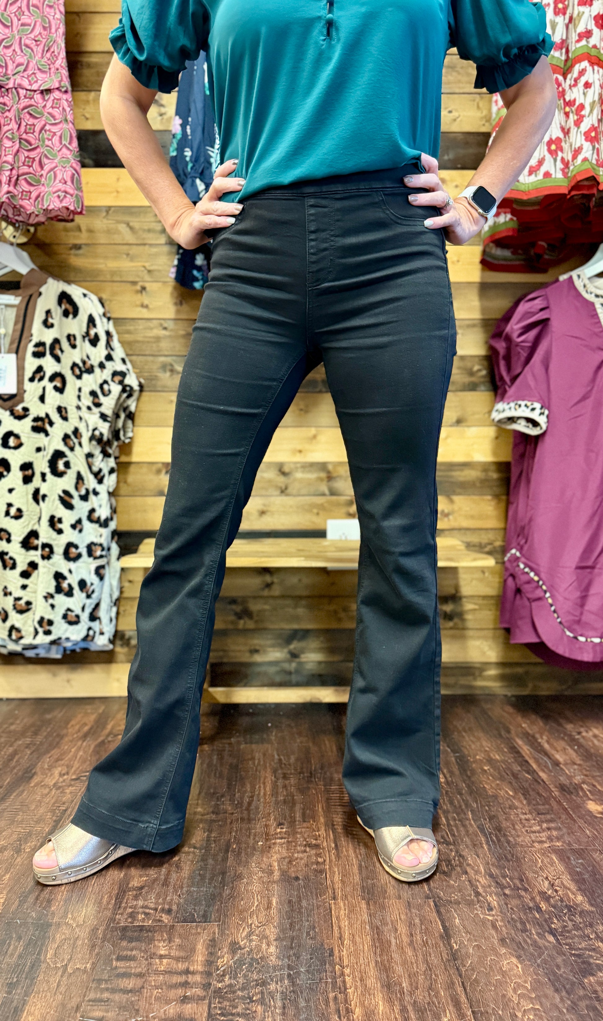 The classic black wash makes these flares a year-round staple — effortlessly flattering and endlessly versatile.