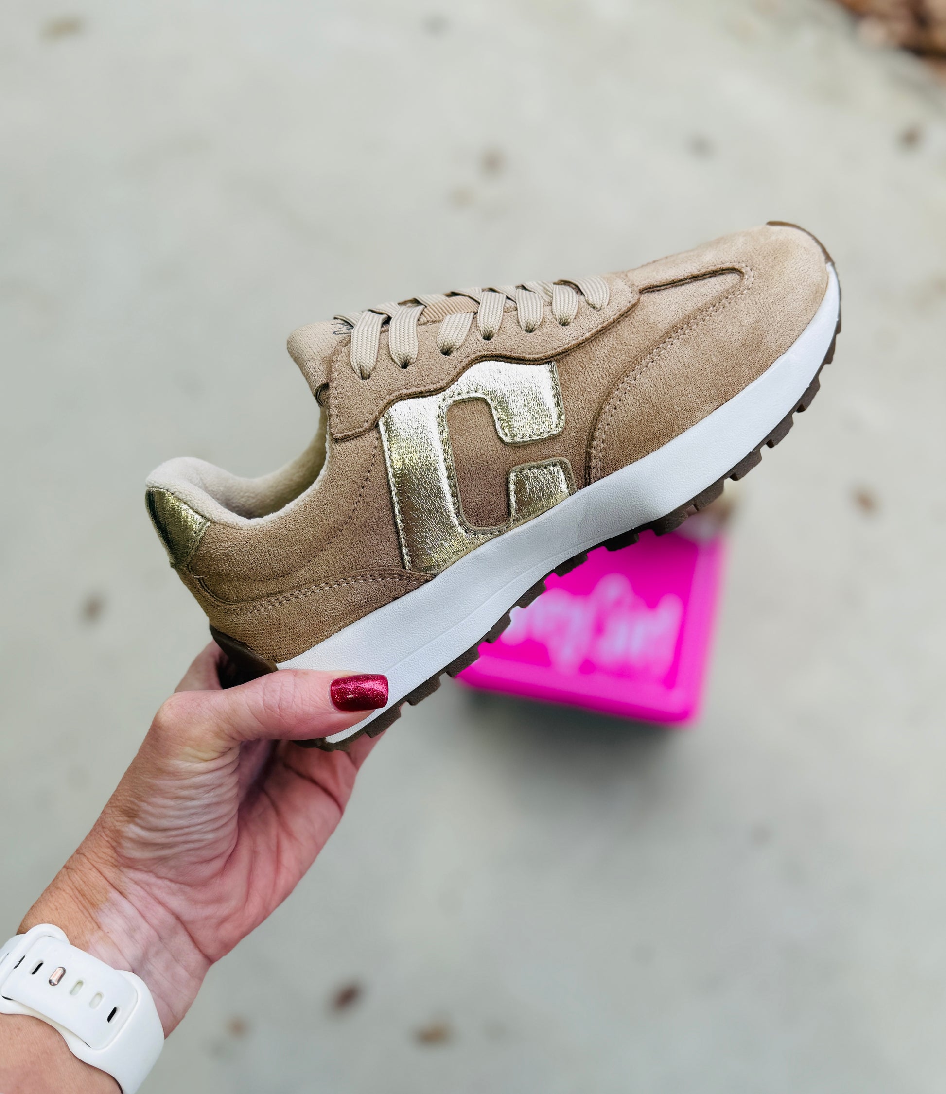 Fresh, comfy, and endlessly versatile — the No Prob Sneaker in Camel Gold is the neutral you’ll reach for on repeat. Crafted in soft faux suede with Corky’s signature cushioned comfort, this bestselling style now features a gorgeous new camel tone paired with metallic gold accents for the perfect hint of shine.