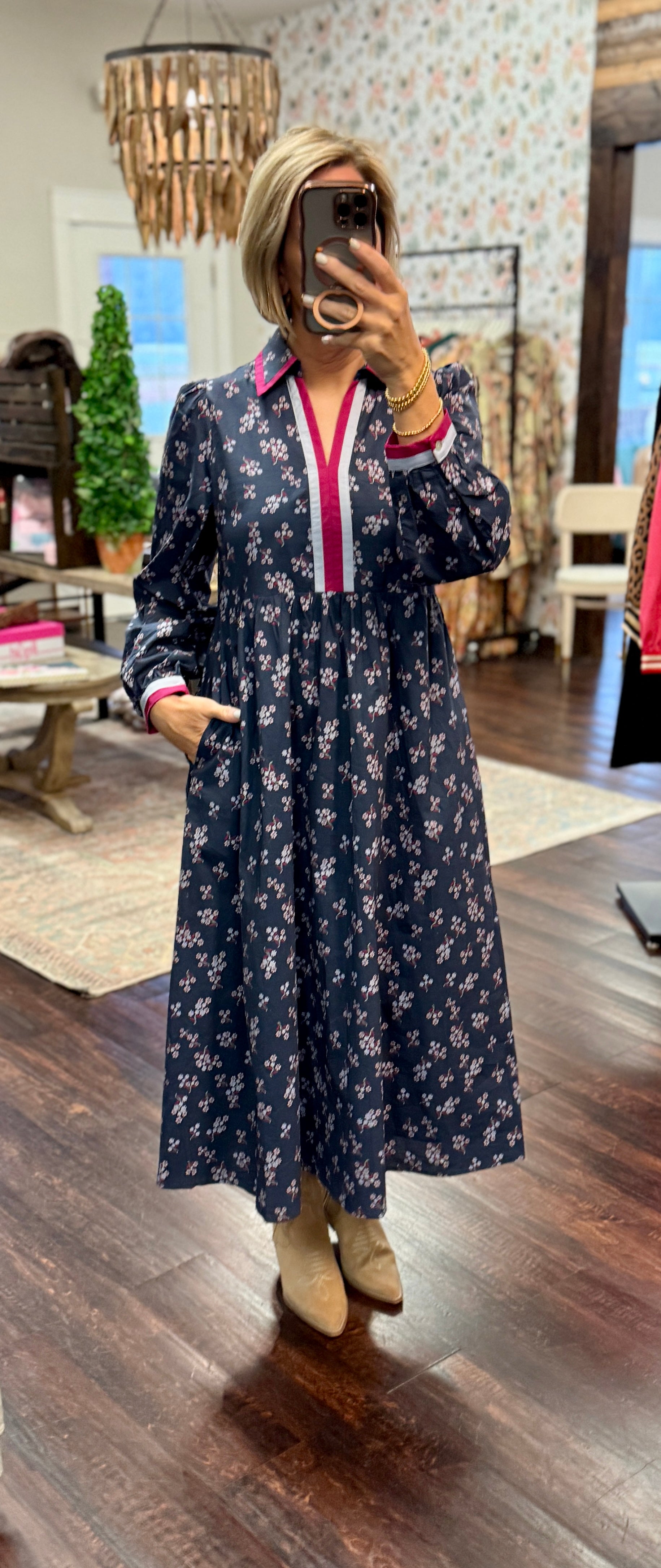 Classic, flattering, and oh-so-comfortable — the Midnight Meadow Maxi Dress is made for those days when you want to look perfectly put together with zero effort. This navy maxi features a delicate meadow-floral print with pops of soft blush and cream, finished with standout contrast trim in fuchsia and ivory along the collar, neckline, and cuffs for that extra touch of boutique detail.