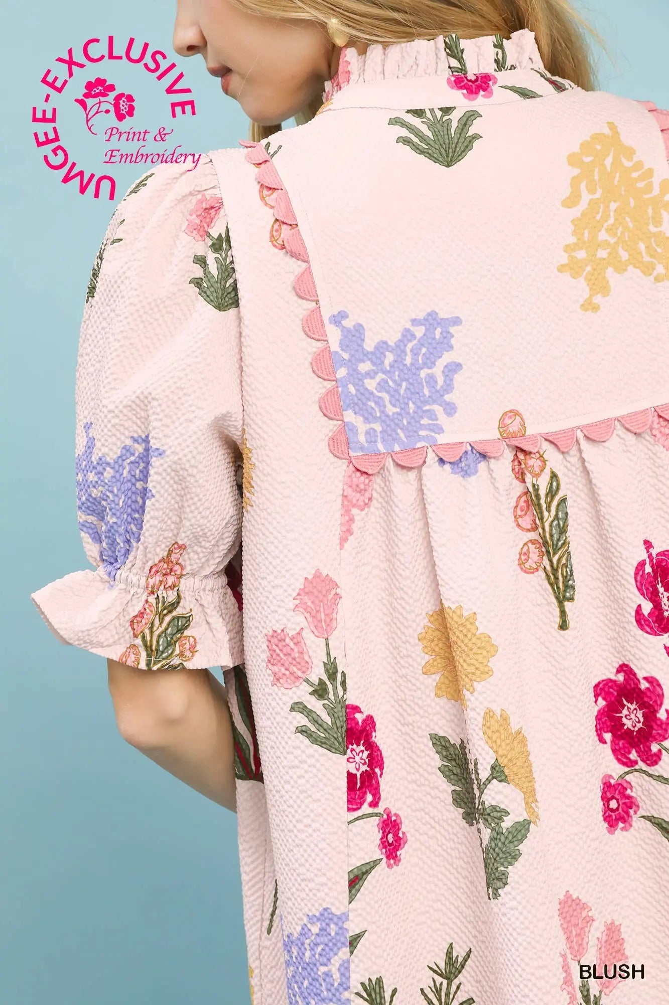 Designed with a beautifully detailed exclusive floral print and embroidery-inspired texture, this dress features a relaxed, flowy silhouette that drapes gracefully without clinging. The structured notched collar neckline adds a polished touch, while the subtle puff sleeves with ruffle trim give it that feminine boutique charm.