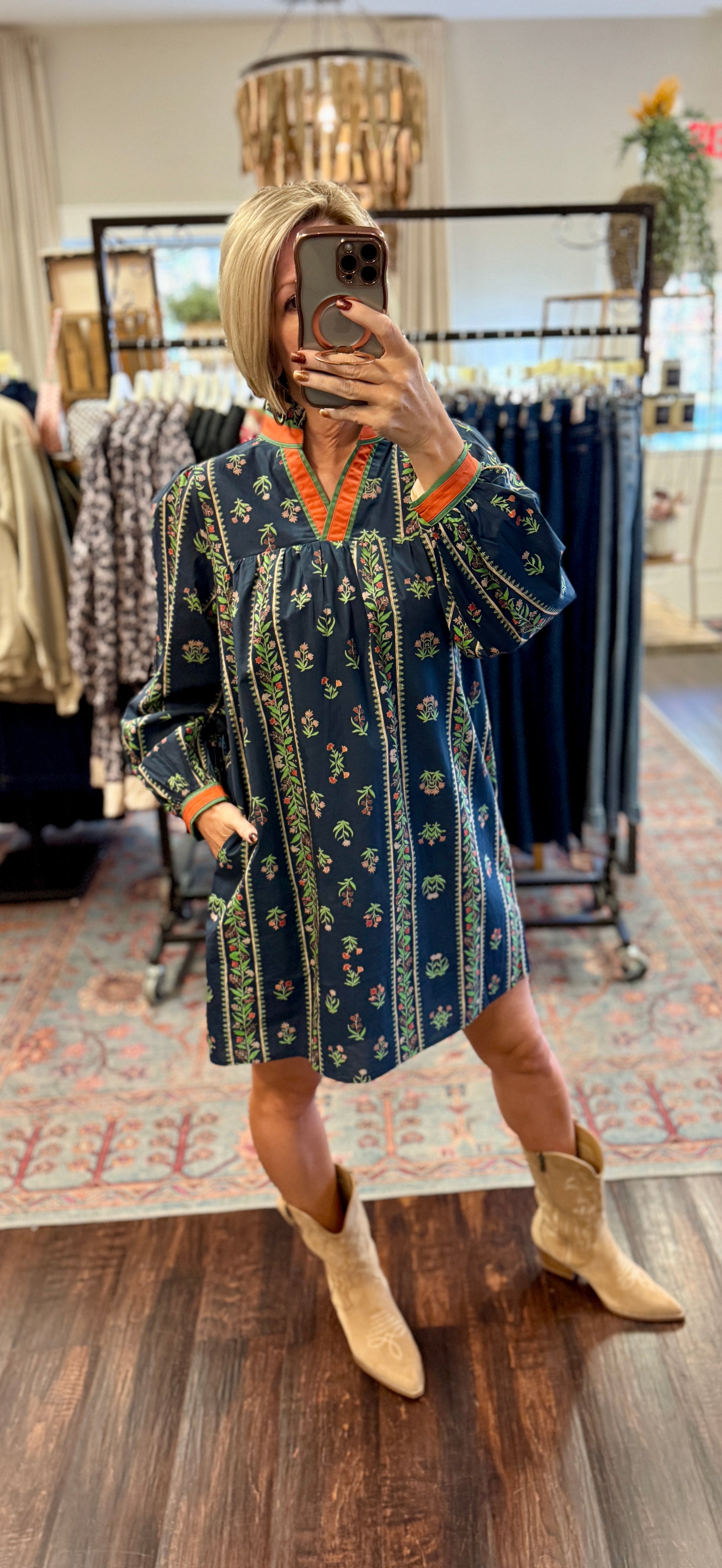 Effortless, chic, and full of charm — The Caroline Print Dress is the perfect mix of comfort and style. Featuring a navy base with a delicate floral stripe print and contrast trim in coral and green, this dress brings boutique elegance with an easy, flowy fit. The gathered neckline, balloon sleeves, and flattering length make it a versatile favorite for any occasion.