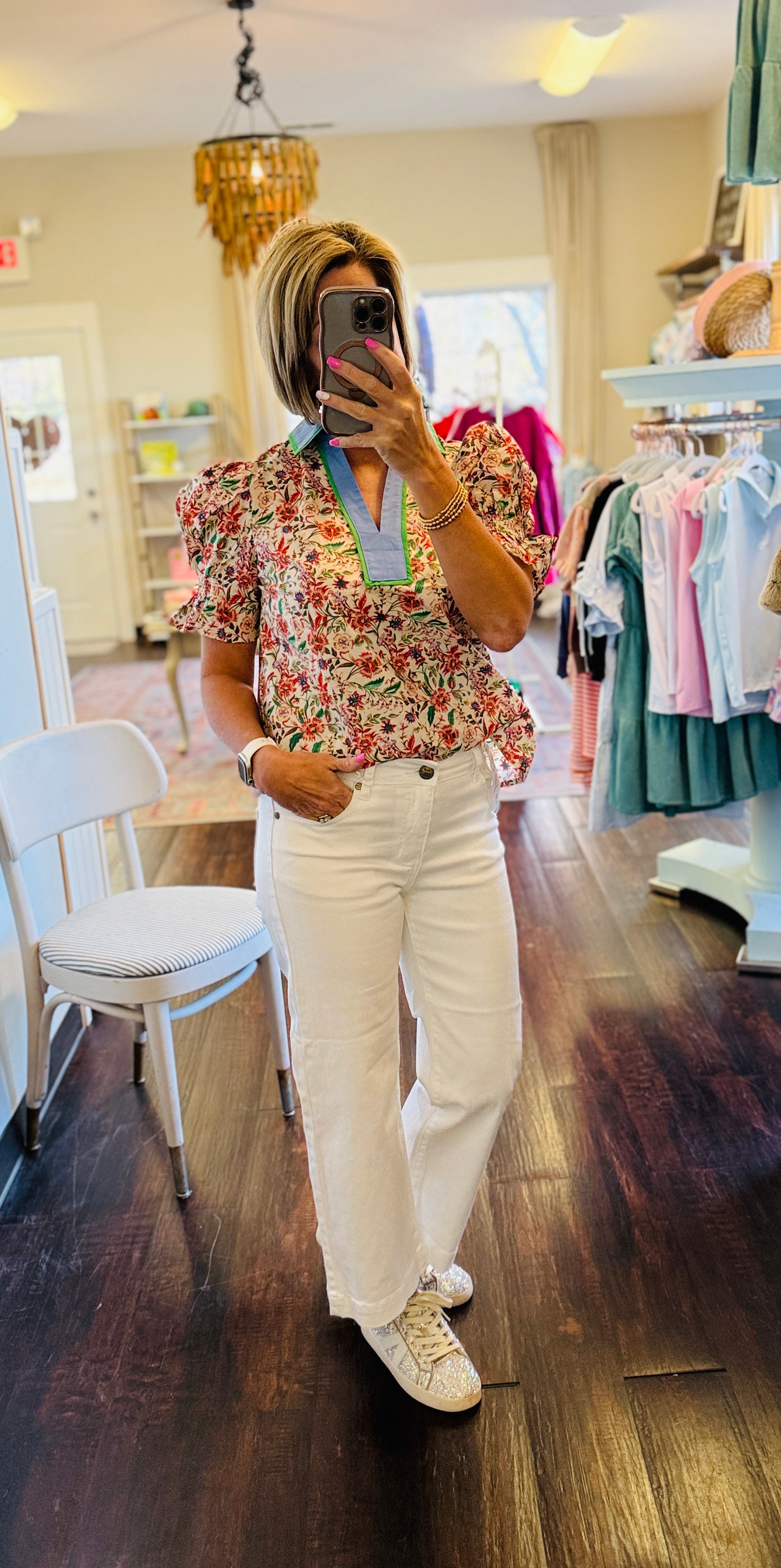 Style it with white denim for a bright spring look or pair it with jeans and wedges for brunch, church, or casual gatherings. The colorful floral pattern keeps it playful, while the structured neckline adds that elevated Cedar Lane touch.