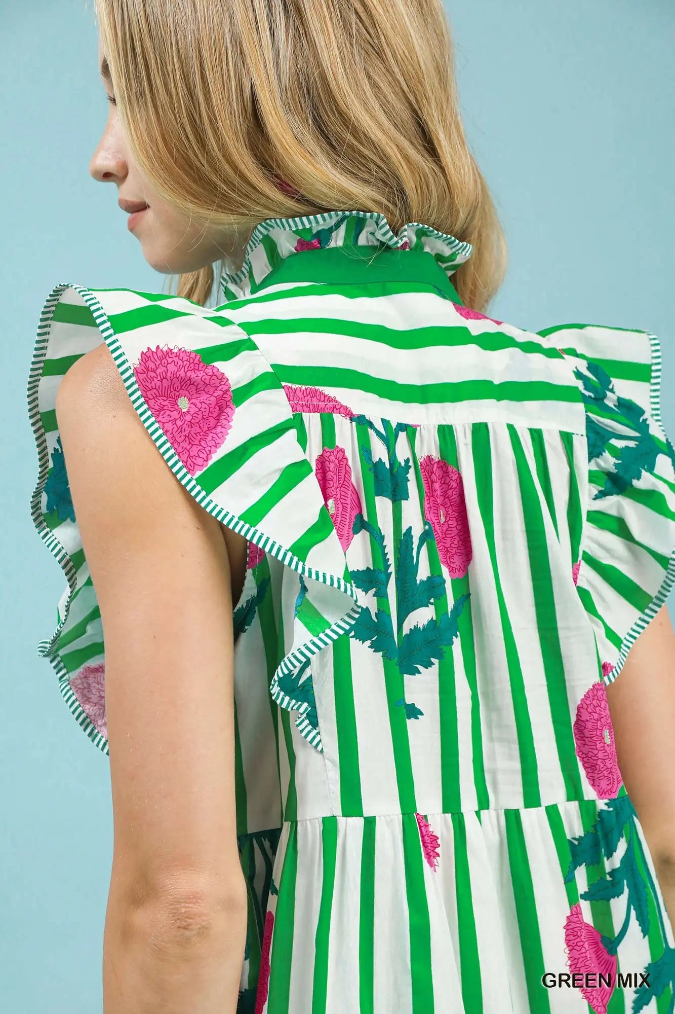 Featuring a vibrant stripe-and-floral print, this midi dress combines classic vertical stripes with oversized floral detailing for a look that feels both timeless and elevated. The contrasting V-neckline adds a polished touch, while the flutter sleeves with delicate trim bring soft, feminine movement.