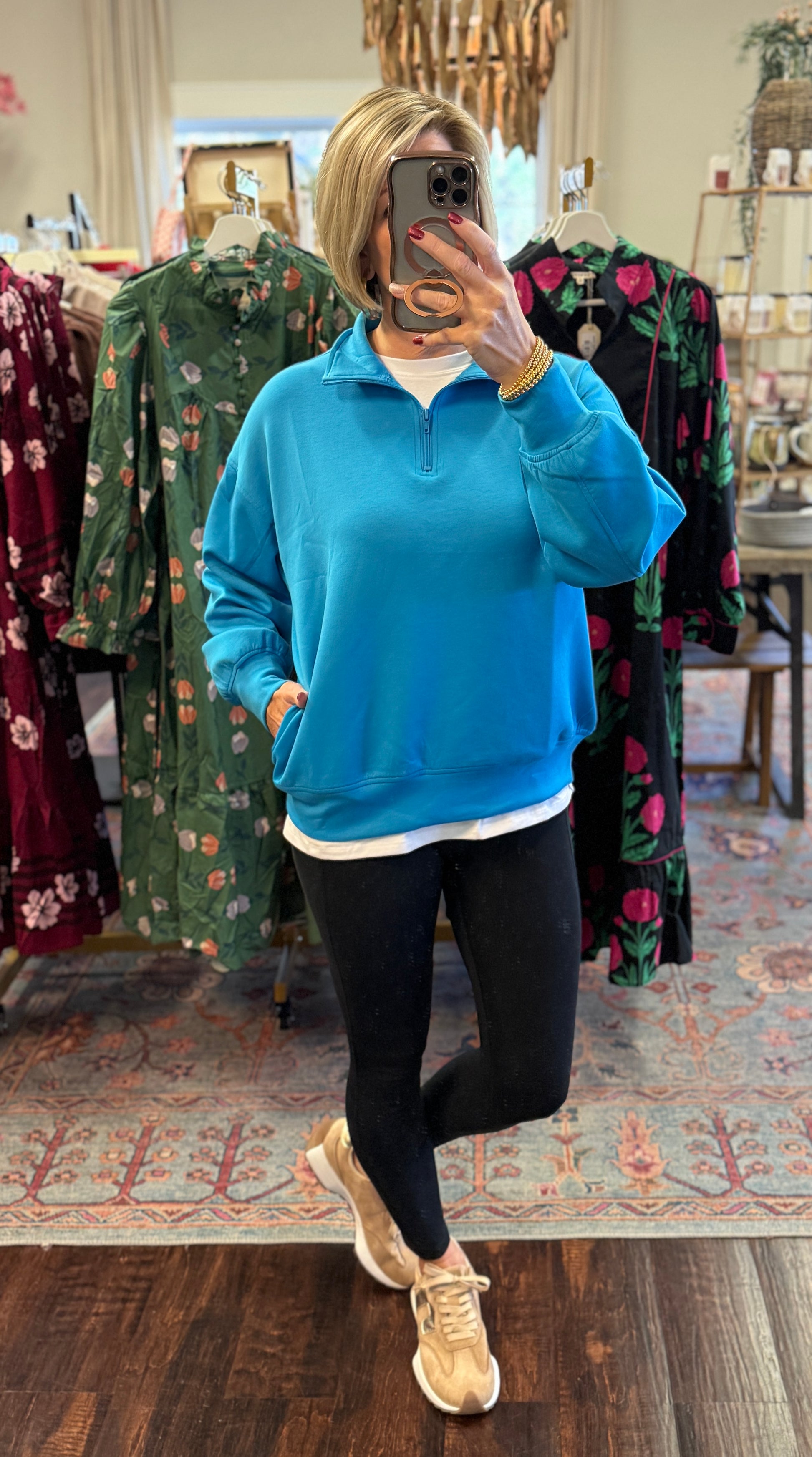 Designed with a soft, premium feel, this relaxed-fit pullover features a classic quarter-zip neckline, subtle balloon-style sleeves, and roomy side pockets — the perfect blend of casual and polished. Layer it over a tee or tank for the easiest grab-and-go outfit.