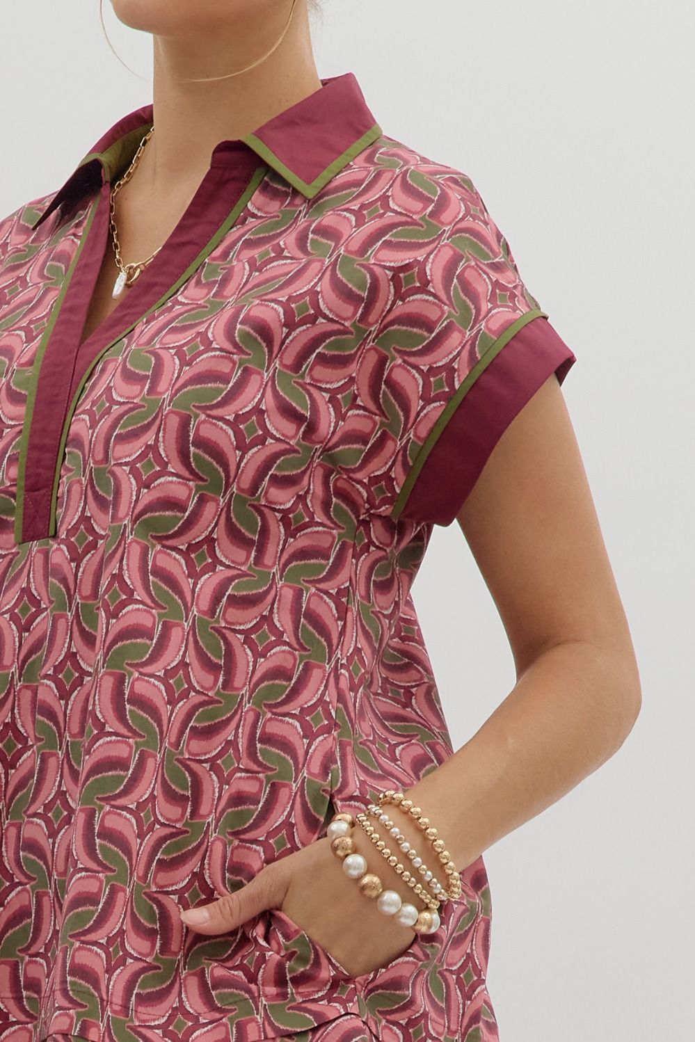 Bold, fun, and effortlessly stylish — The Piper Dress is a total must-have! This flirty poplin mini features a retro-inspired geometric print in rich shades of berry, olive, and blush. The drop-waist silhouette and ruffle hem add a playful twist, while contrast trim on the collar and sleeves brings that extra pop of detail. And yes — it has pockets!