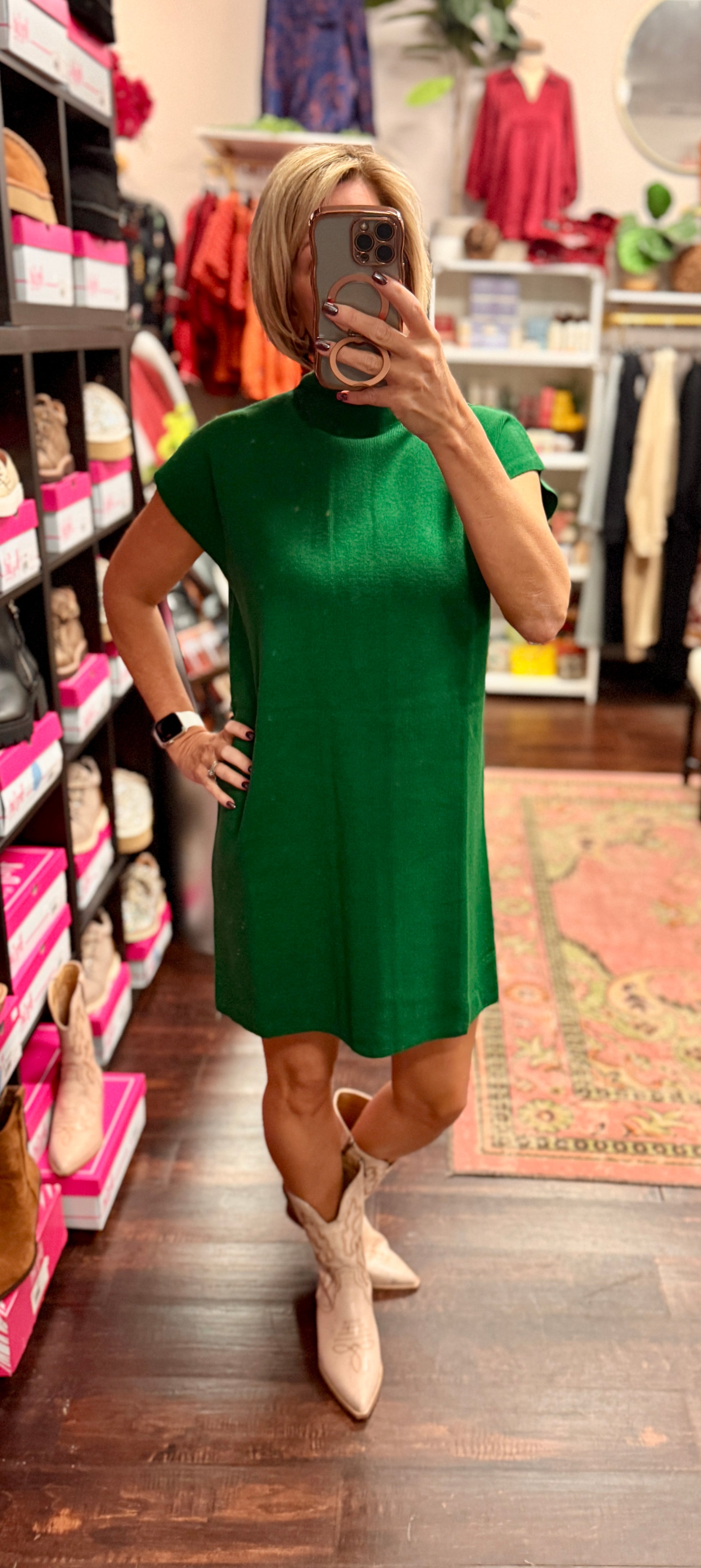 Fresh, feminine, and effortlessly polished — The Evergreen Grace Dress is your new go-to for chic, easy style. This stunning emerald shift features a soft mock neckline, capped sleeves, and a smooth, flattering drape that moves with you. The simple silhouette makes it incredibly comfortable while still giving that elevated boutique look you love.